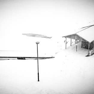 Parken Åre centrum. Stationen syns inte i det vita vädret.